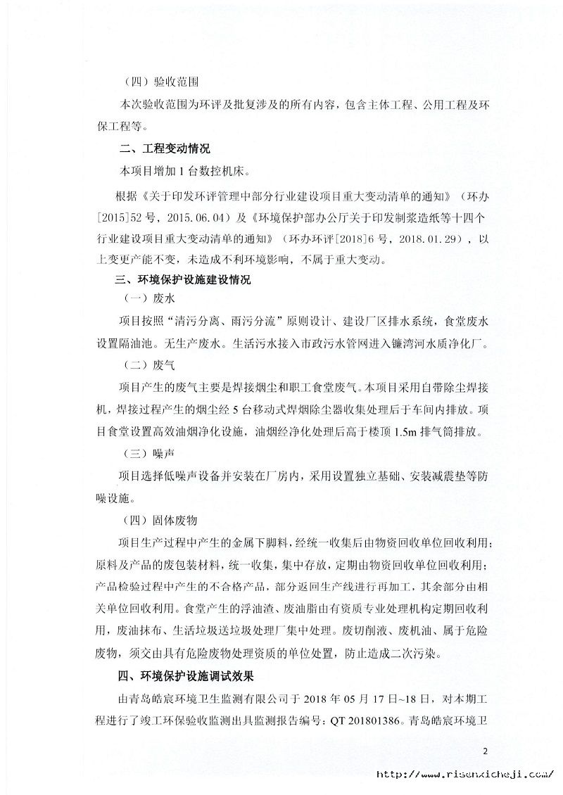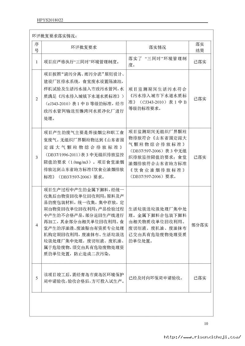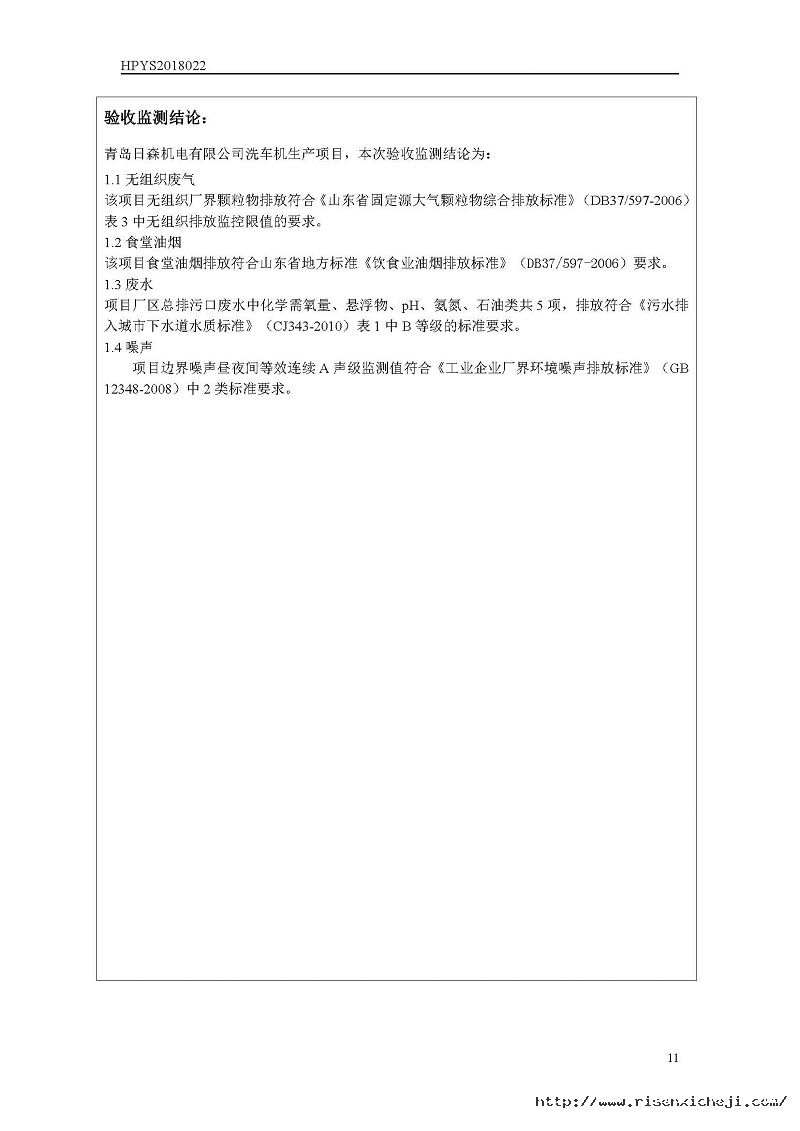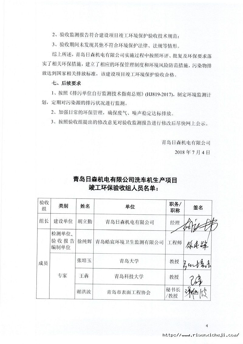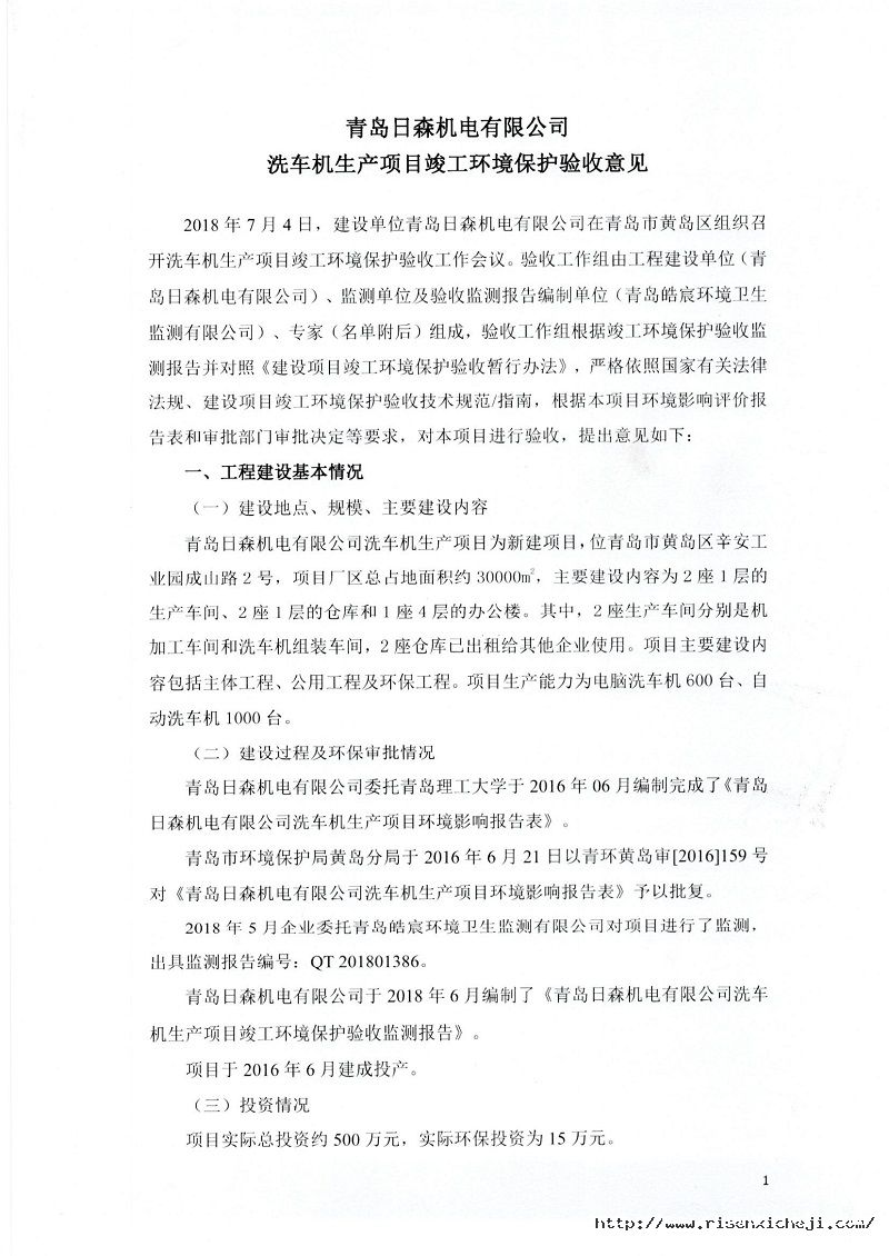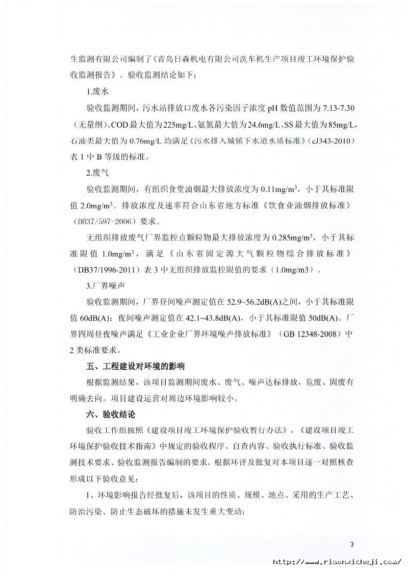 青島日森機電有限公司洗車機生產(chǎn)項目竣工環(huán)境保護驗收意見